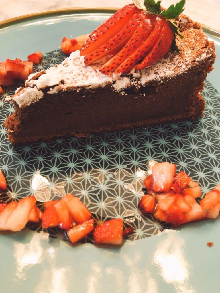 8. Servir tibio o frio, espolvorear el azúcar en polvo y acompañar con ensaladita de fresas.