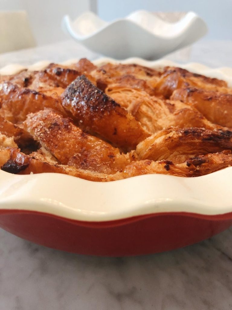 - Cortar los croissant en tajadas y luego cortar por la mitad. Acomodar las tajadas de la parte de abajo de los croissants en un molde mezclándolo con las pasas.